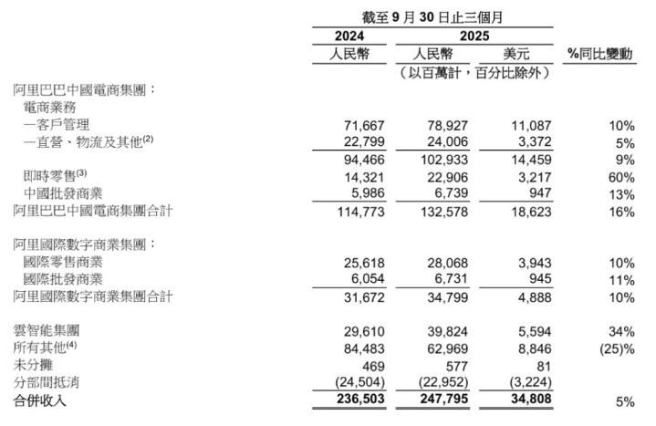 业绩显示,阿里巴巴各业务板块呈现明显分化态势。中国电商事业集团作为集团最大收入来源,贡献营收1325.8亿元人民币,同比增长16%,超过预估的1285.3亿元人民币。