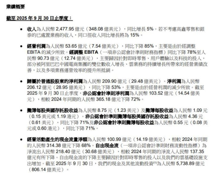 第二季度公司营收2477.95亿元,同比增长5%中国股票配资网站,预估2452亿元;第二季度调整后每ADS收益4.36元,预估6.34元;第二季度中国电商事业集团收入1325.8亿元;调整后净利润103.5亿元,预估168亿元。(注:阿里巴巴的2026财年Q2是自然年的2025年7月1日至9月30日。阿里巴巴的2026年财年是从自然年2025年4月1日至2026年的3月31日。)