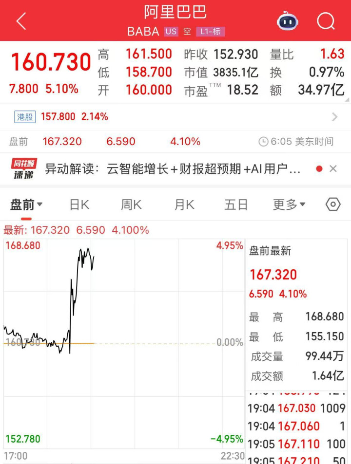 市场方面,阿里巴巴美股盘前股价直线拉升,截至发稿前上涨4.10%。